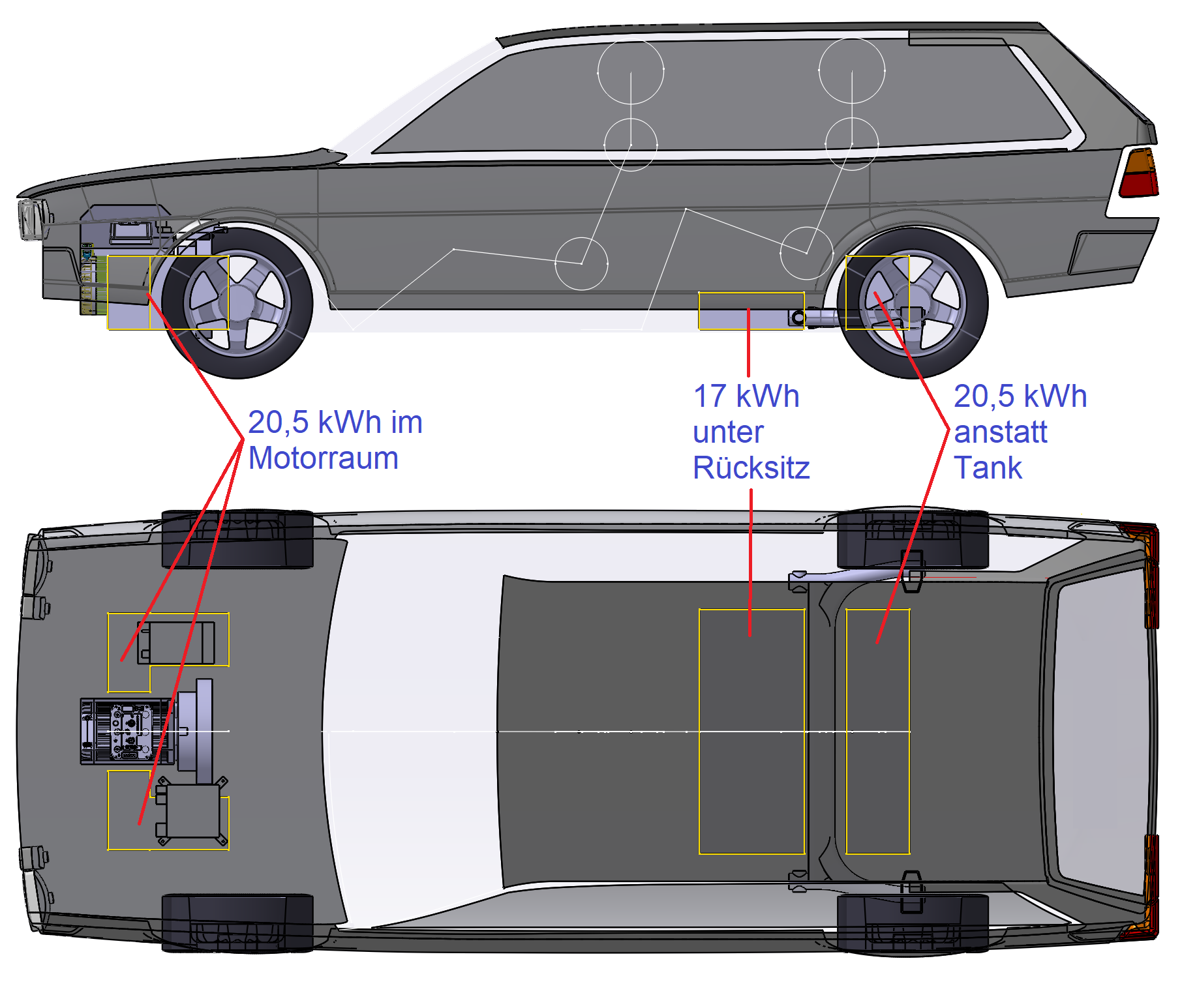 Nun wรผrde sich ๐ต๐ฉ๐ฆ๐ฐ๐ณ๐ฆ๐ต๐ช๐ด๐ค๐ฉ als nรคchstes der Bauraum unter dem Kofferraum anbieten. ๐จ๐๐๐ es ergeben sich nun schon etwa 130kg Mehrgewicht im Heck. ๐จ๐๐๐ wรผrde ich die restlichen 20,5 kWh vorne im Motorraum mรถglichst weit hinten und niedrig platzieren.
